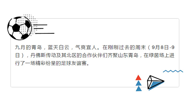 8日上午,在丹佛斯傳動中國區副總裁盧中平和北區合作伙伴代表北京聯澤總經理劉劍濤的致辭中,足球賽拉開了帷幕!本次足球賽本著“友誼第一”的原則,為大家提供了一個既可以感受足球魅力,又可以相互交流的平臺。并以此為契機,激發熱情,強健體魄,凝聚力量!