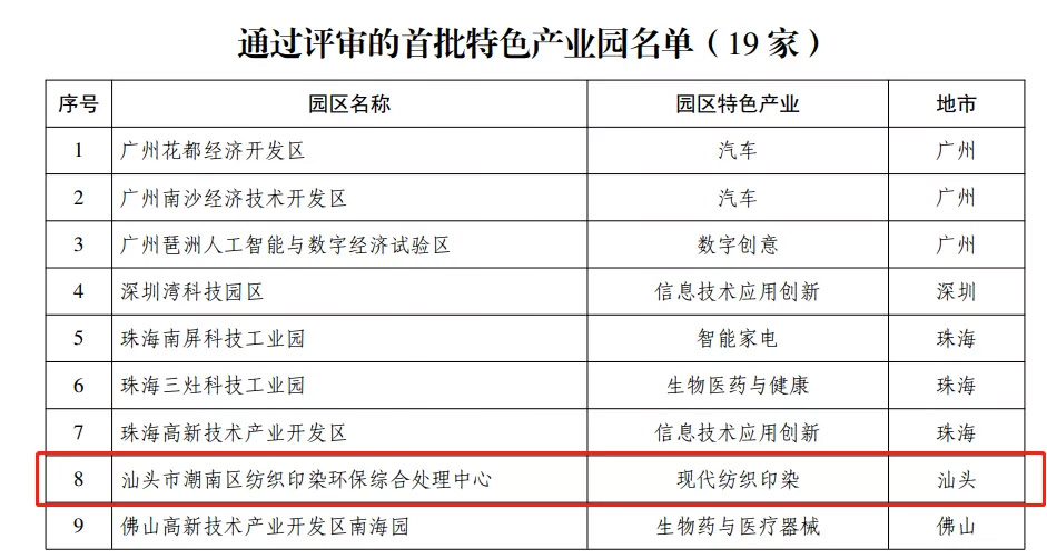 近日,廣東省工業和信息化廳網站發布《廣東省制造強省建設領導小組辦公室關于公布首批特色產業園名單的通知》,中信環境潮南區紡織印染環保綜合處理中心(以下簡稱中信環境潮南印染產業園)榜上有名,是現代紡織產業的唯一代表。