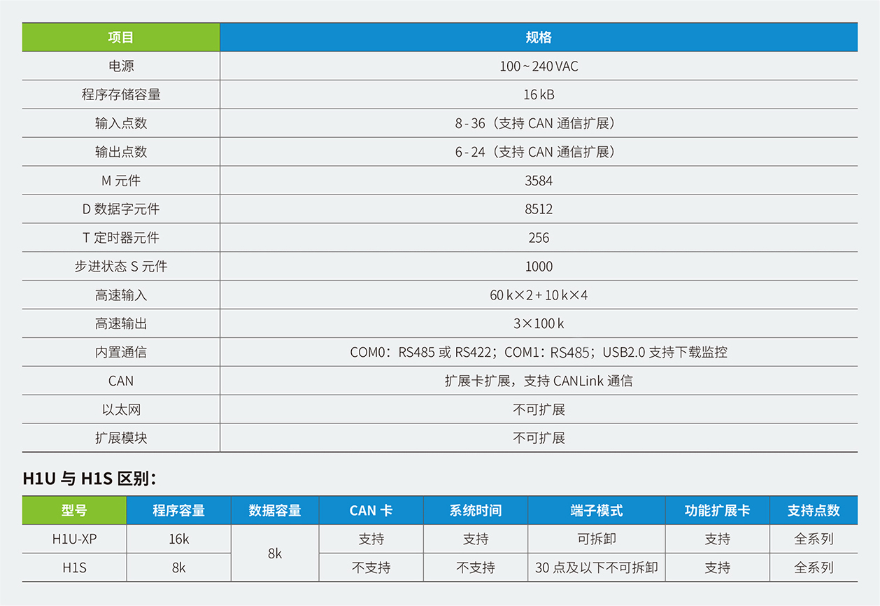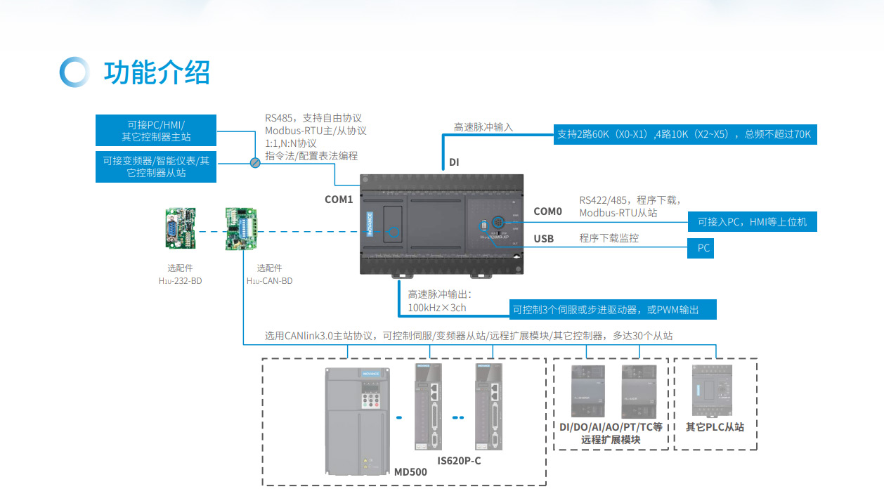 H1U系列PLC 隸屬匯川小型PLC 經濟型系列,其主要特點具備小體積,大程序容量,并具備3 軸高速100K 脈沖以便實現高精度定位。支持CANlink 擴展卡擴展H2u 系列的遠程擴展模塊來豐富IO。該系列PLC 點數覆蓋14~60 點。是小型自動化設備高性價比的選擇。