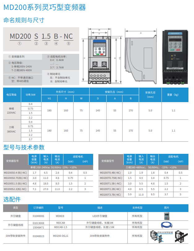 MD200系列緊湊型變頻器是匯川技術(shù)基于小功率、小體積、低成本的市場(chǎng)需求,針對(duì)性推出的單相220 VAC 和三相380 VAC 迷你變頻器。MD200 采用V/F 控制方式、無(wú)速度傳感器矢量控制方式(SVC),具有高功率密度、高EMC 規(guī)格設(shè)計(jì)、高防護(hù)性能等顯著優(yōu)勢(shì)。